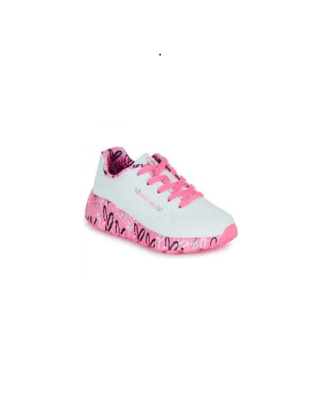 Internationally renowned muralist James Goldcrown brings his iconic #Lovewall heart designs to Skechers in this inspiring collaboration. Cute and colorful style meet in the Skechers x JGoldcrown: Skechers Street™ UNO Lite -B Lovely Luv. This lace-up fashion sneaker features the artist's signature heart design on the midsole, synthetic durabuck and perforated trimmed upper with a Skechers Air-Cooled Memory Foam® insole.