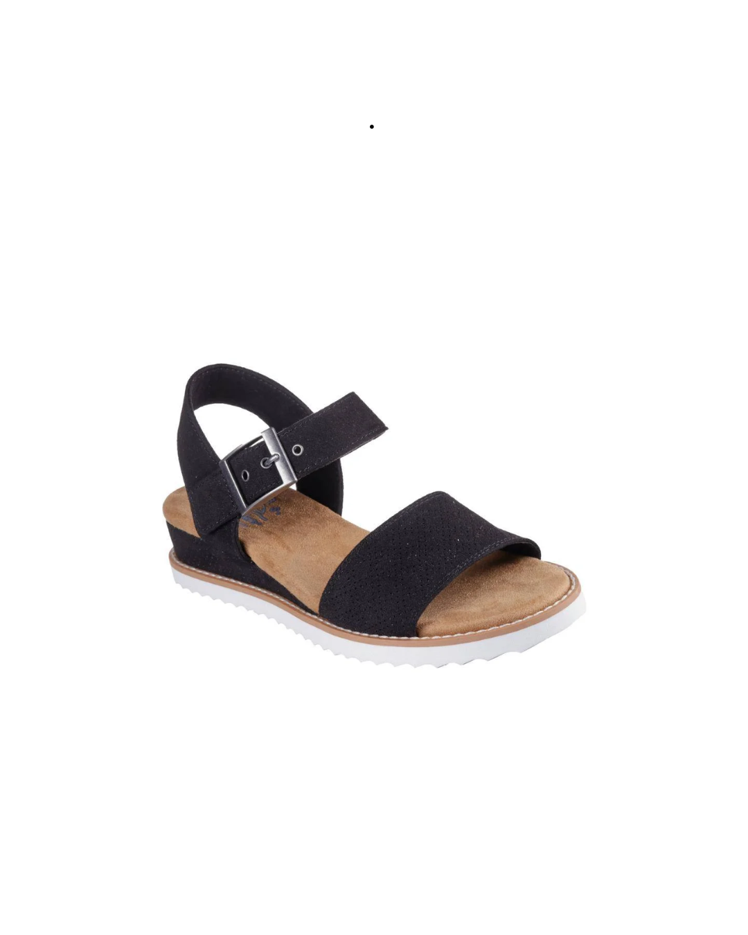 Get warm weather ready wearing BOBS® from Skechers® Desert Kiss - Serendipitous. This vegan fashion wedge sandal features a faux suede upper with perforation details, a metallic-buckled instep strap, perforated midsole trim, plus a cushioned Skechers Memory Foam™ footbed.